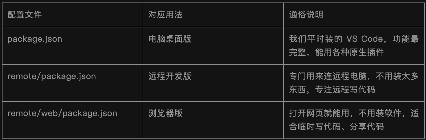 VS Code 能装在电脑上用、能在浏览器里用、还能远程连其他电脑用,核心是它有3个“配置文件”(package.json),就像同一个模板,根据不同场景调整一下,就能适配不同用法,避免互相干扰: