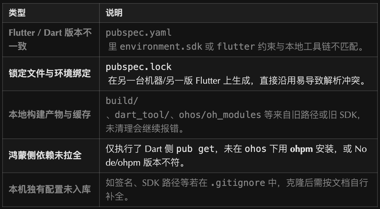 从同事电脑拷贝目录,或从 Git 克隆 Flutter OpenHarmony 工程后,执行 flutter pub get、flutter run 或 flutter build hap 时出现 依赖解析失败、编译报错、ohos 模块找不到、运行闪退 等,而在原环境正常。