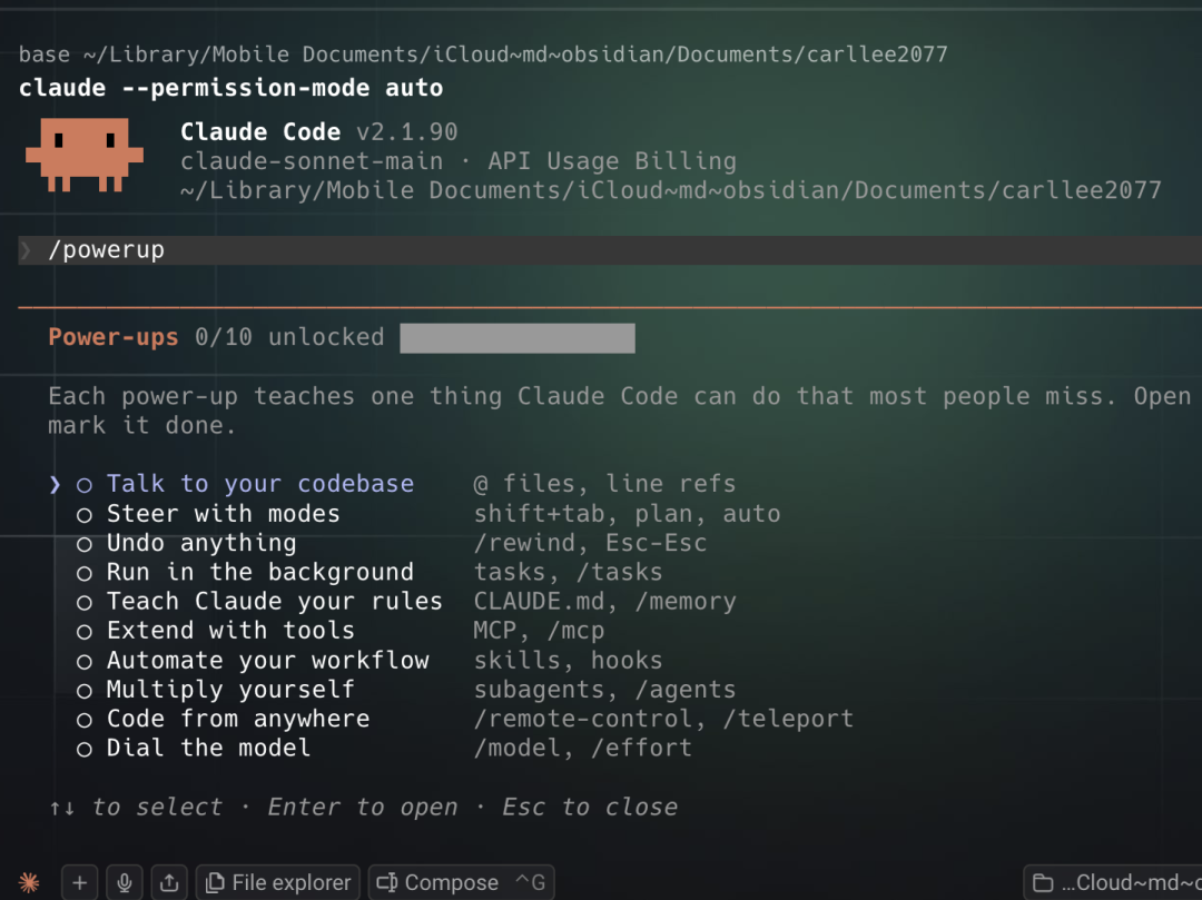 /powerup就相当于Claude Code版的多邻国,它一共分十关,每一关都会教你几个核心技巧,从怎么和代码库(项目)对话,怎么撤销操作,到怎么把任务放后台运行,怎么让CC记住你的偏好,甚至于怎么制作子Agent,怎么用手机远程控制等等。