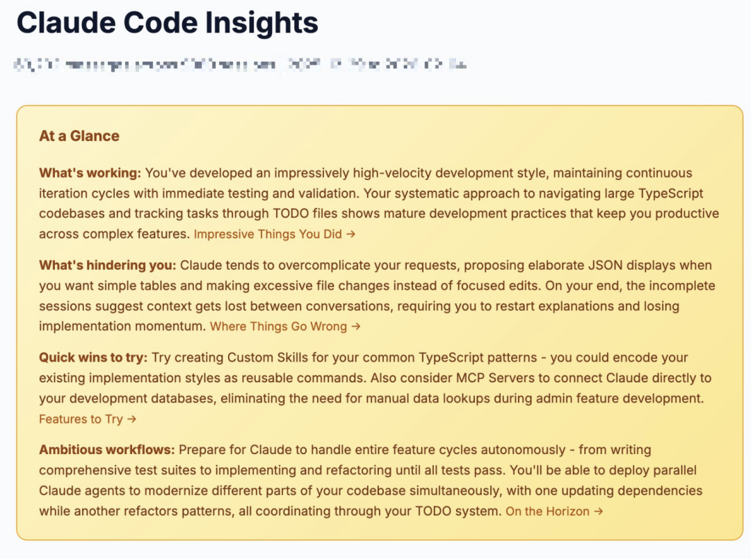 /insight会生成一份过去一个月我使用Claude Code的习惯报告。这份HTML报告里会反映出你最常用的命令是什么,哪些操作模式是高度重复的。它还会推荐一些可以自定义的命令或者现成的Skill。