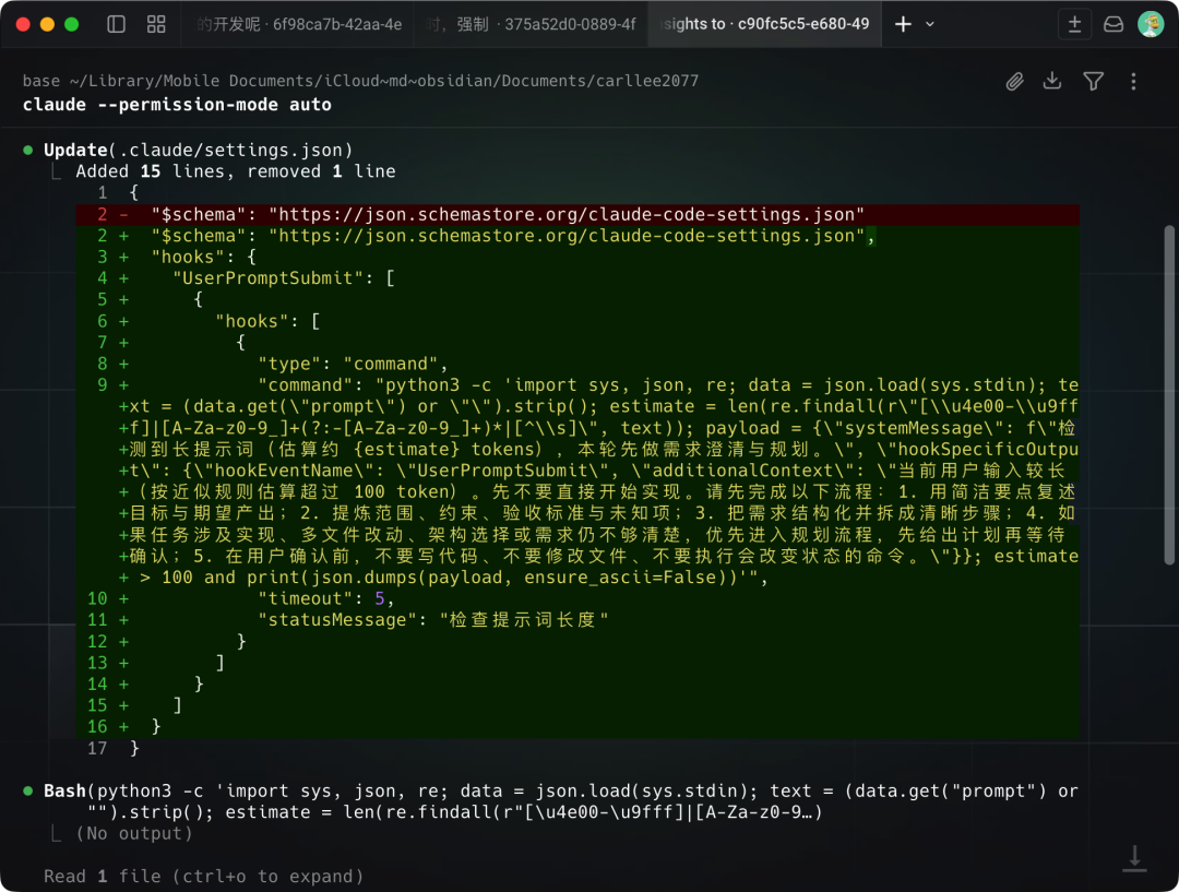 我刚开始还有一个坏习惯,就是在对话开始时,扔给它一大段零散,未经思考的需求,说白了就是语音输入一大段文本。很多时候AI理解偏差,一来一回浪费了我时间。所以我做了另一个Hook,