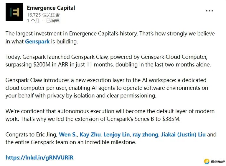 前不久,其投资方Emergence Capital在LinkedIn公开发文称,Genspark的年化收入运行率在约11个月内突破2亿美元。在当下AI应用赛道里,这样的增长速度依然属于第一梯队。不过需要注意的是,年化收入运行率更多是基于当前收入节奏的年化推算,并不等同于企业已经实际入账的收入规模。