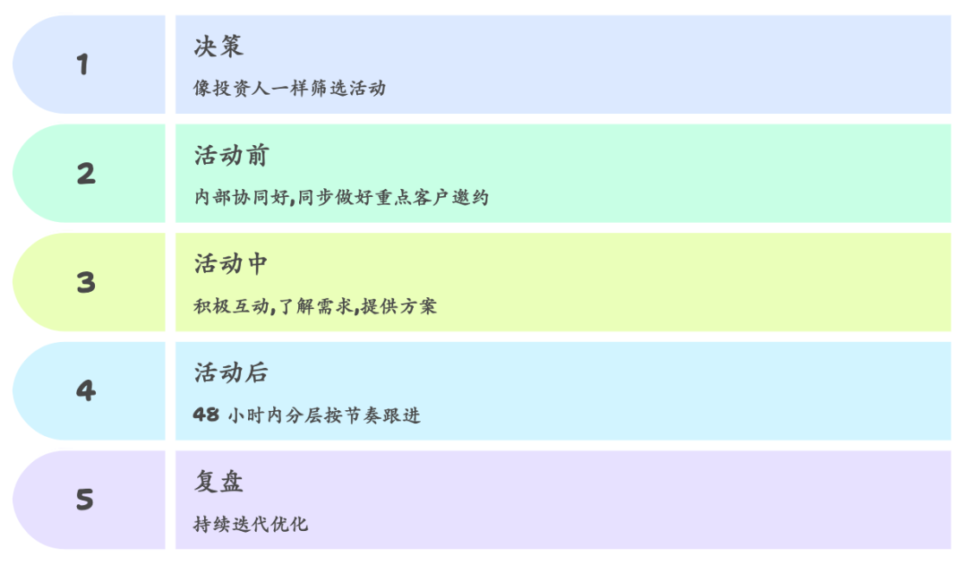 5) 活动是否季度冲刺期或最忙的时间点?如果销售全员都在忙着关单,技术部门都在忙着研发,没人能支持现场活动,那就先别做。