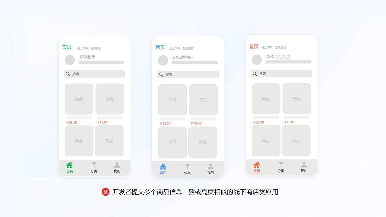 场景3:不收录开发者提交多个高度相似的线下商品类应用,如**超市、**便利店、**综合商店。