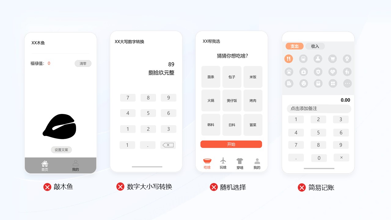 场景4:不收录应用市场已饱和的应用类别,如敲木鱼、数字大小写转换、随机选择、简易记账、简易记事本,智能遥控、助眠睡眠、证件照、色彩助手、手持弹幕、播放器等。