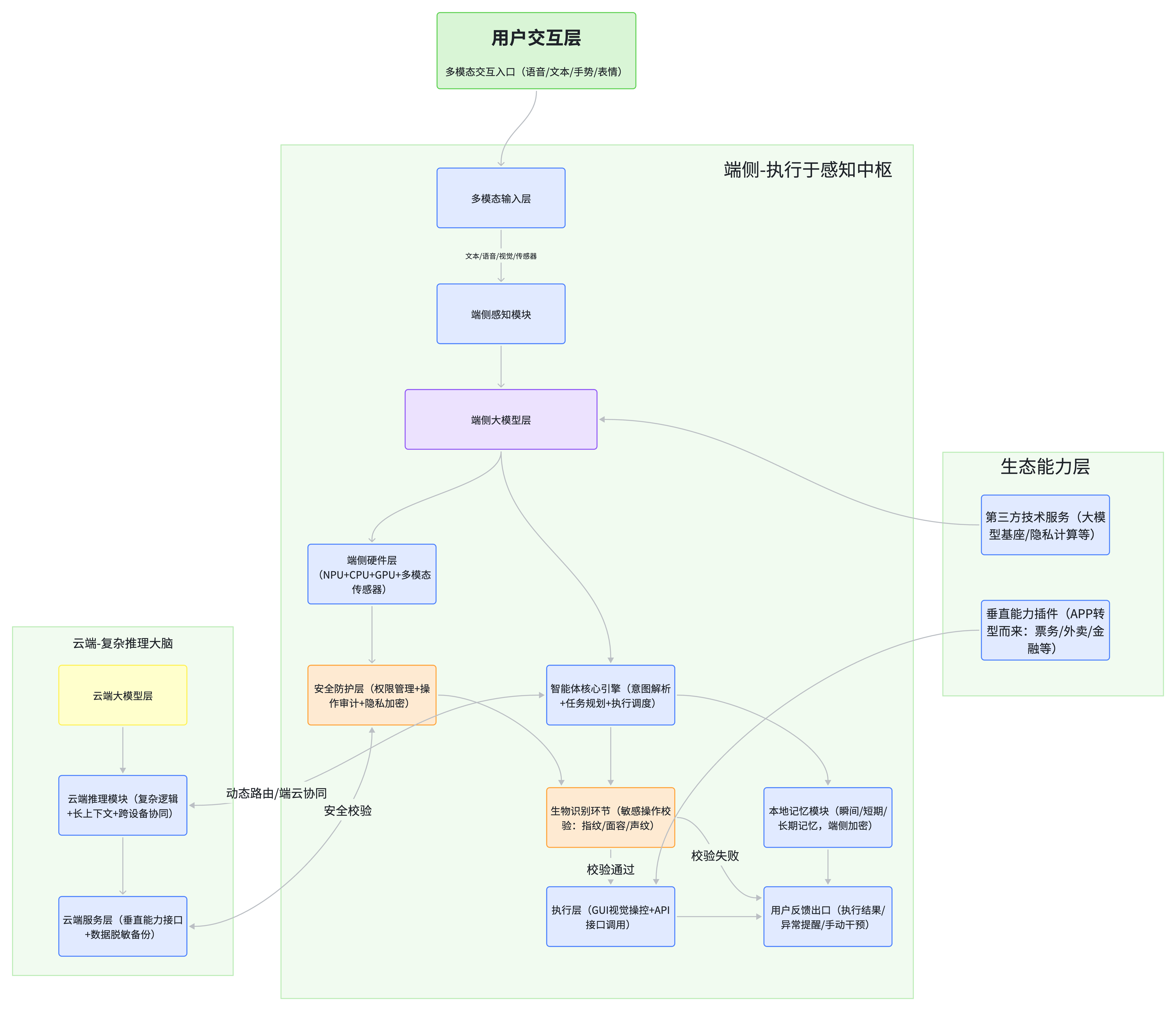 AI智能体手机的核心技术架构,以“端云协同”为核心,以“安全可控”为底线,以“多模态感知-自主决策-执行反馈”为闭环,新增生物识别特殊校验环节,分层清晰、衔接流畅,适配各玩家协同需求,贴合当前技术现实并预留演进空间。