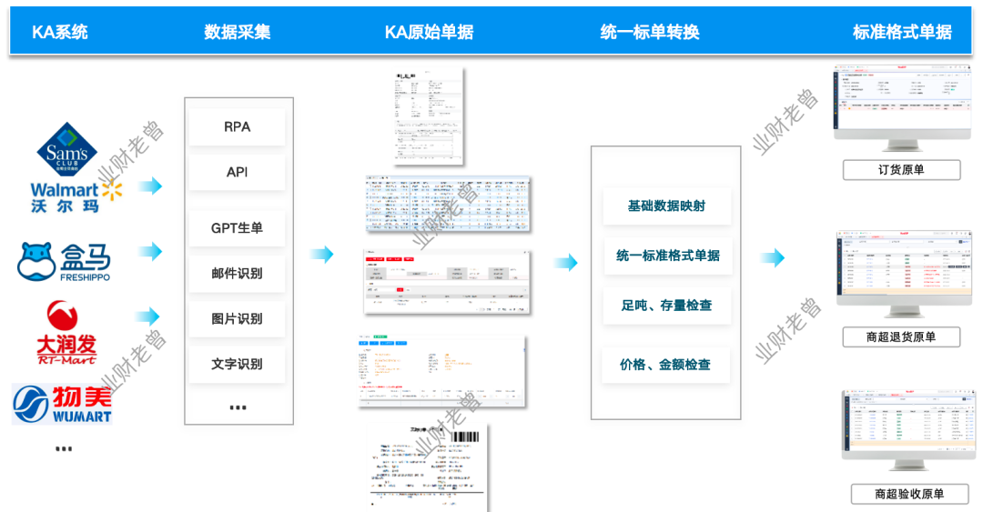品牌商或经销商在经营 KA 渠道(如山姆、盒马、大润发、物美、永辉等商超)时,订单、退货单、签收单多为线下手工登录KA的后台下载,再手工录入到自家ERP中,存在三大核心痛点: