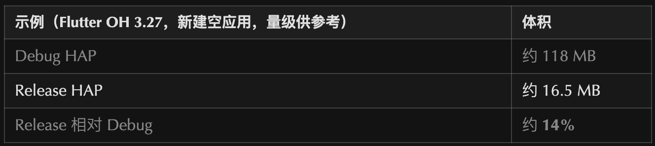 Release 包应 明显小于 Debug 包。可用「近似纯净」的 Flutter OH 工程作参照: