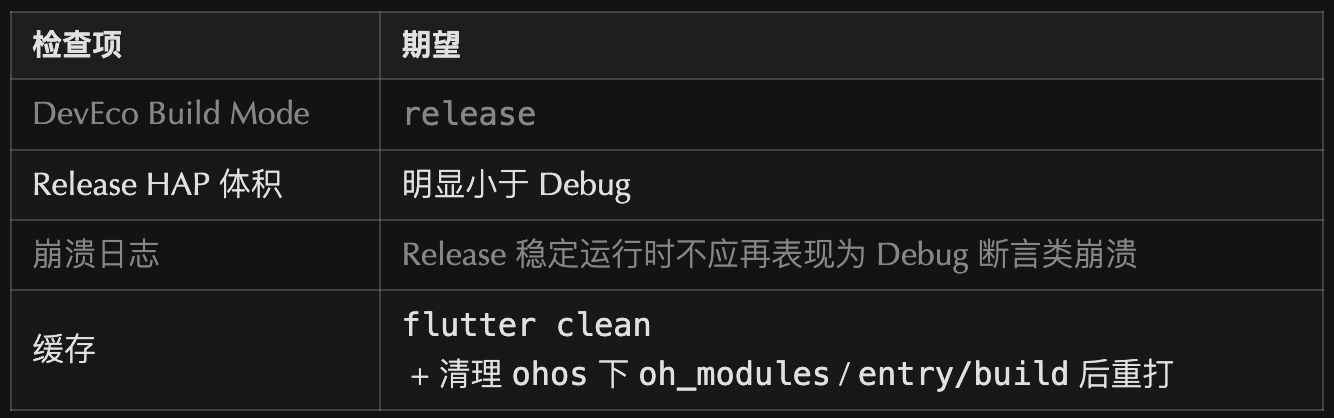 若主要用 **flutter build hap –release**,仍建议在排查阶段 清缓存后重打一次包,并确认没有其它脚本或 CI 步骤在覆盖 flutter.har 或混用 –debug / 本地 debug 引擎路径。