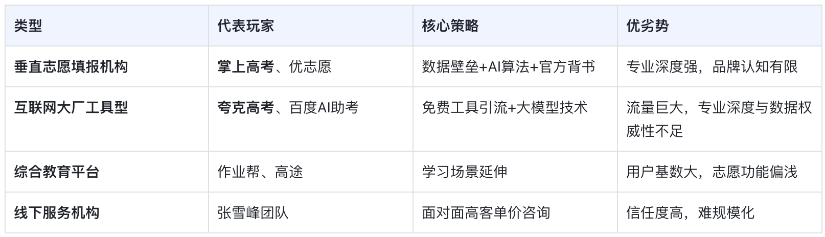 - 政策环境:教育部2025年升级“阳光志愿”系统,上线“智慧小招”AI助手免费服务。这对商业化平台构成压力,但倒逼行业向深度差异化发展。