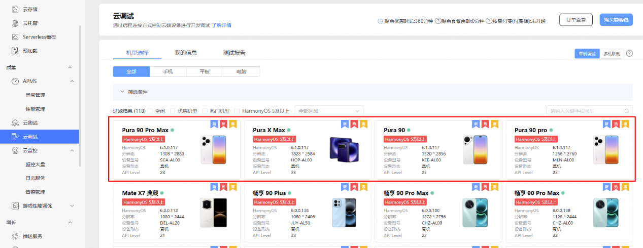 4月20日,华为新品发布会上,华为Pura90系列和阔折叠Pura X Max正式亮相。为了让开发者能够第一时间适配新机型,HUAWEI AppGallery Connect 云调试服务已正式上线Pura90、Pura 90 Pro、Pura90 Pro Max以及Pura X Max真机。点击上方链接,选择Pura90系列和Pura X Max,即可使用。
