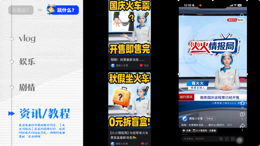 当工具型产品陷入功能解释与同质化营销的困境,携程火车票业务选择用AI重塑沟通逻辑。‘程火火’作为硅基KOE,在公域以鲜活人设和四类内容剧本与用户‘交朋友’,在产品内则化身服务代理,让复杂行程‘说人话’。这场台前幕后联动的双线叙事,正将冰冷的工具转化为有温度的旅行伙伴。