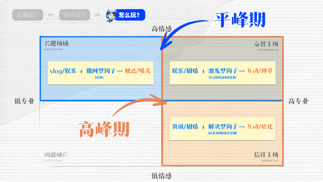 在平峰期,咱主打一个高情绪价值:用兴趣内容搭配“撒网型钩子”广泛触达,在娱乐与剧情内容中植入“激发型钩子”悄然种草。整个节奏,如春雨般润物无声。