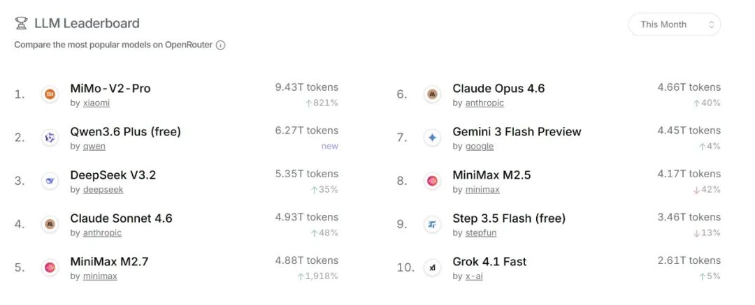 来源:OpenRouter LLM Leaderboard(2026.3.22-2026.4.21)