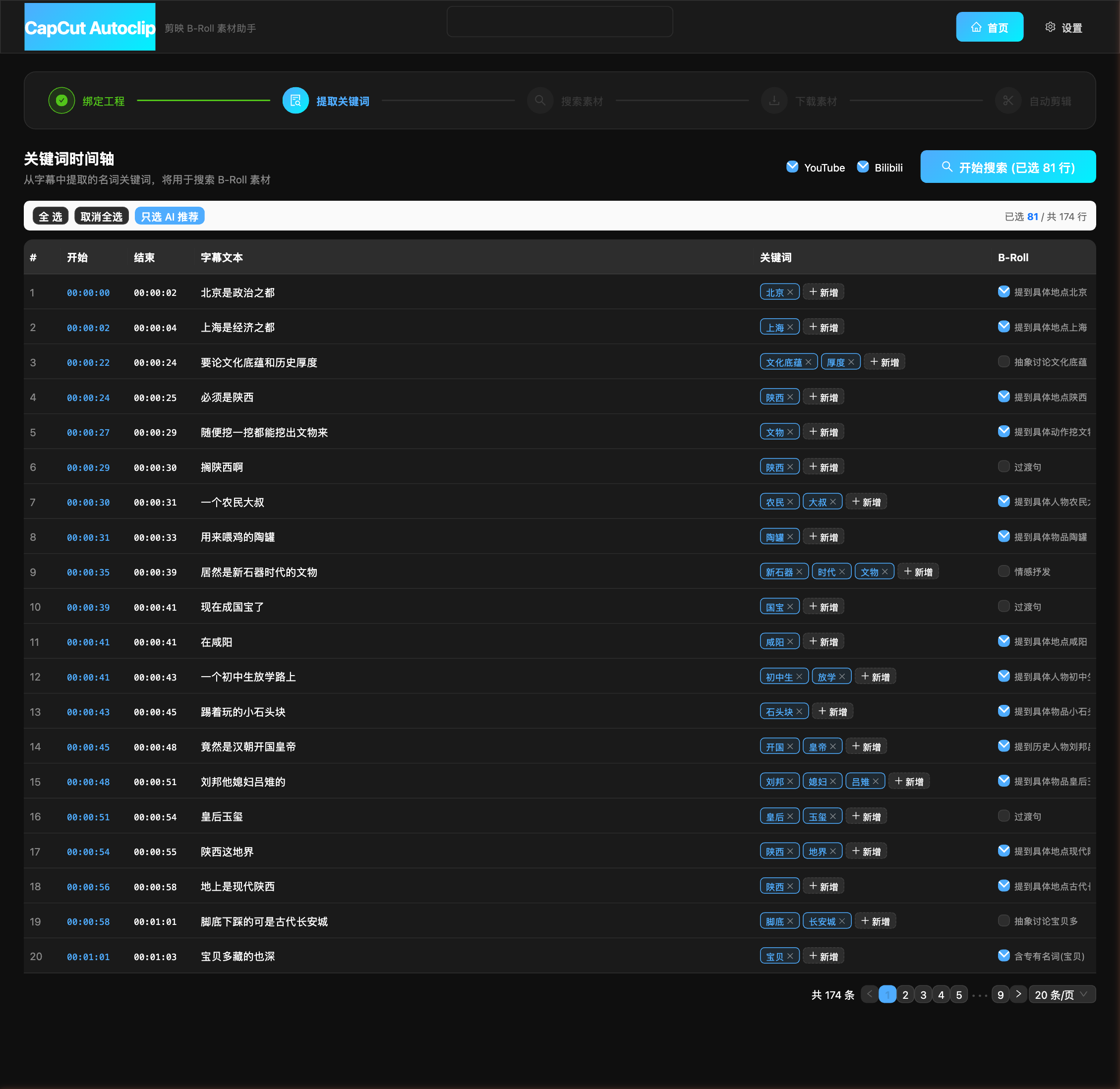 不是每一行字幕都需要。情绪表达、过渡语句、口播解说类的内容,强行配 B-Roll 反而会打断节奏。这需要对内容有理解,而不只是机械地”有字幕就搜”。
