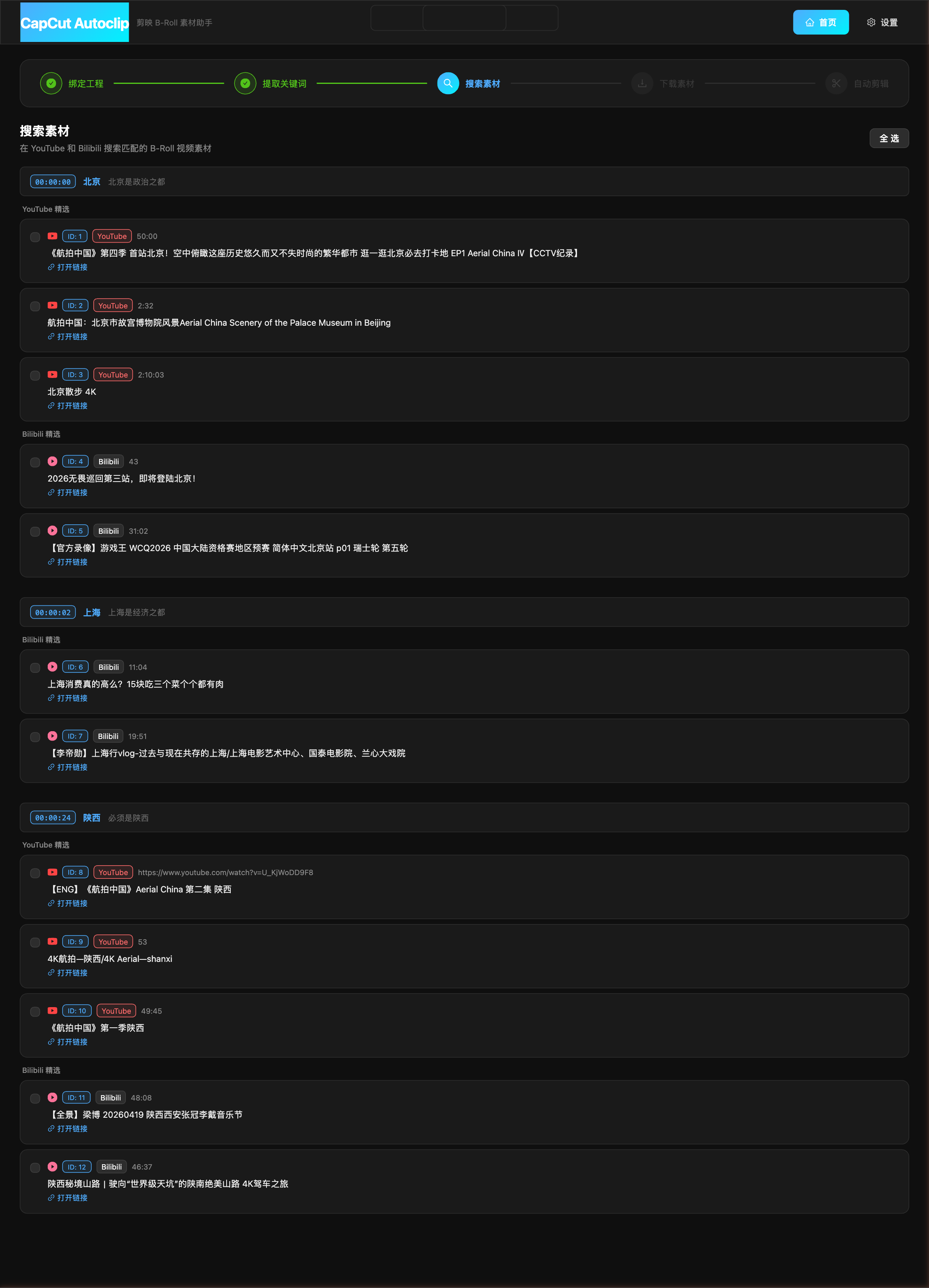 关键词不等于搜索词。搜”张家界”,结果大概率是旅行 Vlog——有人脸、有解说音轨,根本没法直接用作 B-Roll。真正需要的是”航拍”、”实拍”、”无解说”类的纯景素材。从字幕到有效搜索词,中间有一层转换。