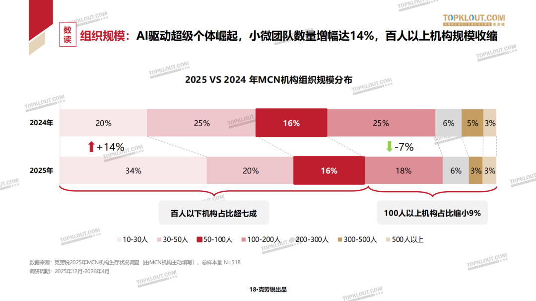 - 14%:小微团队逆势增长,增幅达14%,AI正在催生“超级个体”,百人以上机构规模收缩。