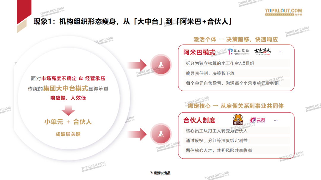 例如阿米巴+合伙人的机制。如今,传统的集团大中台模式被越来越多机构视为笨重,响应慢、人效低、决策链条长。取而代之的是独立核算的小工作室、项目组,决策权下放,每个小单元自负盈亏,核心员工也从打工人变成合伙人。