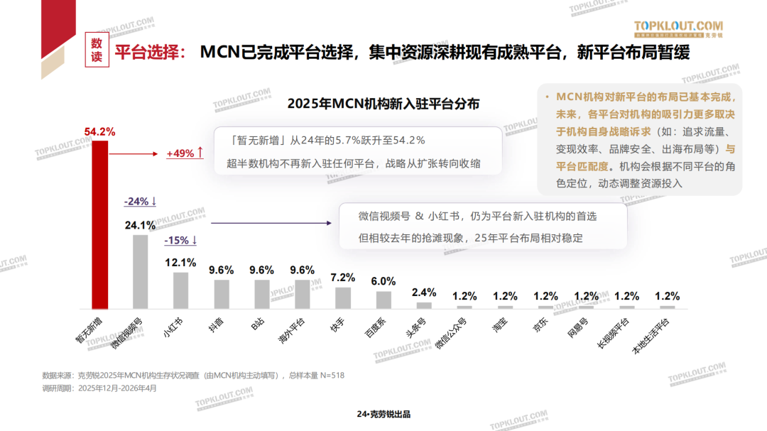 54.2%的机构在2025年没有新入驻任何平台。一年前,这个数字只有5.7%。