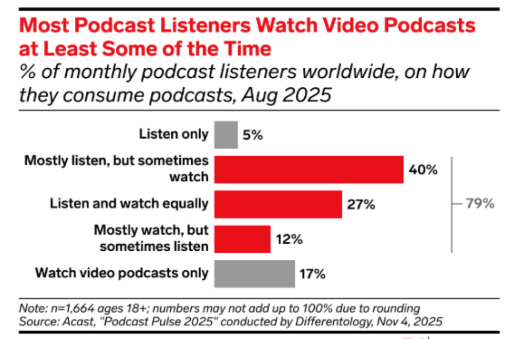 注:根据Acast于2025年8月发布的调研数据(样本量n=1,664,年龄18岁以上),全球月度播客听众中,仅5%「只听不看」,这意味着高达95%的播客听众至少会偶尔观看视频内容,视频播客已变为主流消费方式。