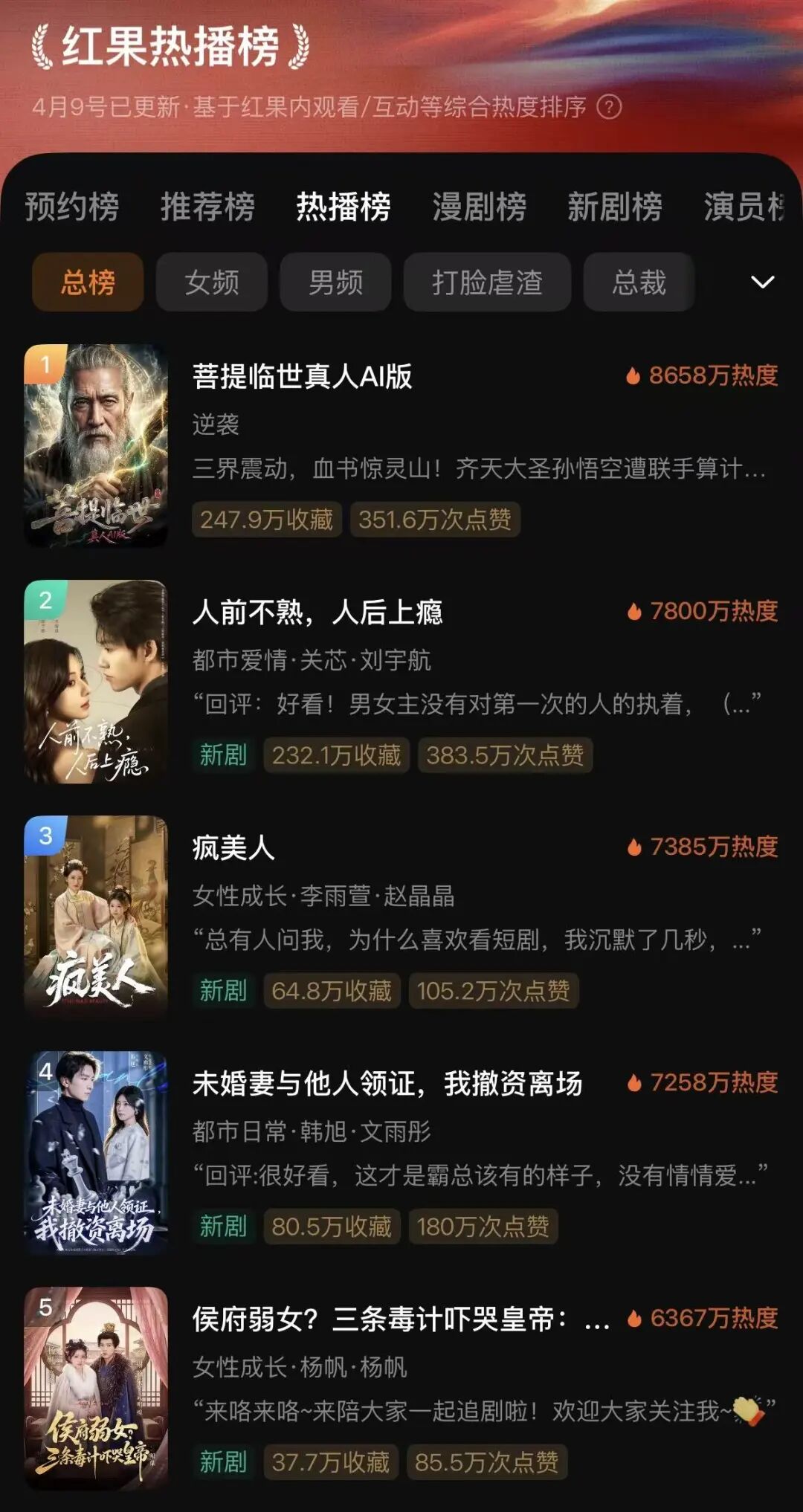 用户端表现更为惊人:4月9日红果短剧开始将AI剧与真人剧合并排名,当天首播的《菩提临世真人AI版》登顶总榜第一,为首次AI真人剧超越真人剧。而近半个月来,热播榜前99名中AI剧的占比稳定超过三成。