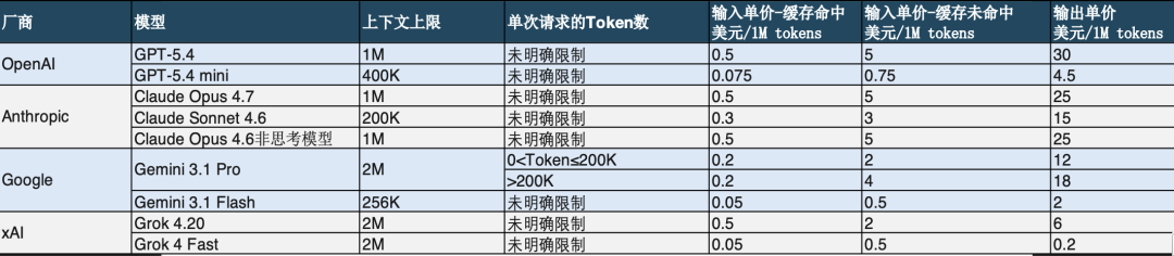 海外头部大模型API调用计价(截至2026.4.24),刺猬公社手动统计,仅供参考;数据来源:各平台官网