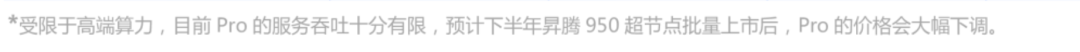 华为昇腾芯片在DeepSeek 官方公告中被提及,虽然只是以出现在图片注释中的低调形式。在更新公告的定价说明截图下,有一行注释小字:“受限于高端算力,目前Pro的服务吞吐十分有限,预计下半年昇腾950超节点批量上市后,Pro的价格会大幅下调。”