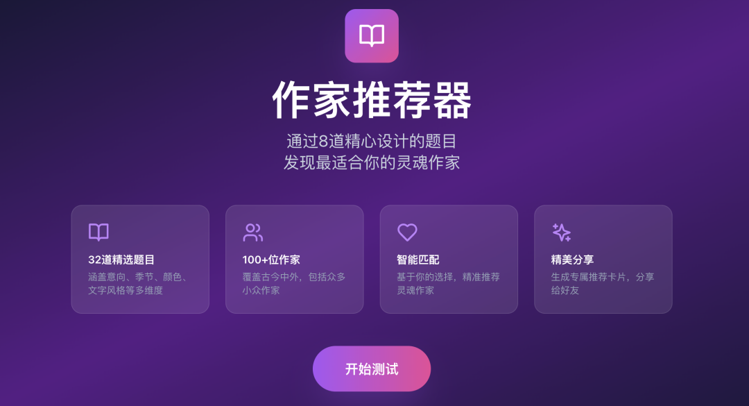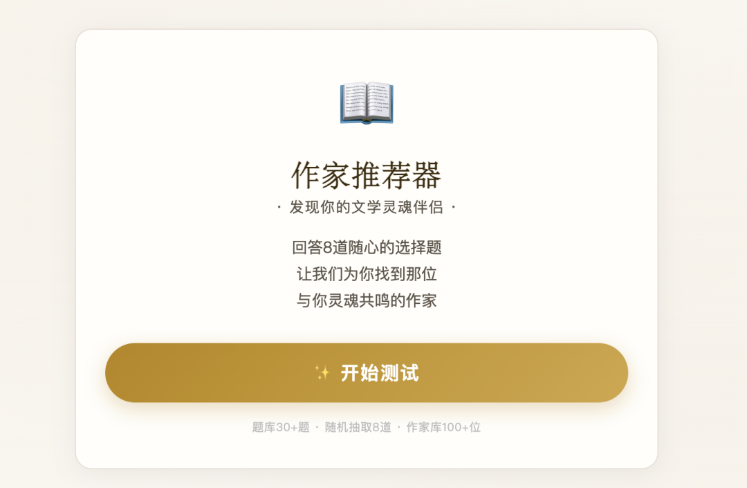 秒悟是阿里巴巴ATH事业群于将近10天前发布的AI开发平台,让0代码能力的用户能使用自然语言完成自己的产品开发。刚上线时,我让秒悟做了一个《作家推荐器》,通过给用户做8道选择题判断TA可能喜欢的作家,题库一共30道,覆盖100位作家。经过大概1个小时的调试后,这个测试小网页上线了: