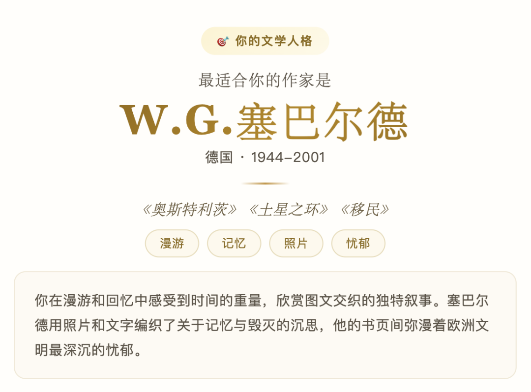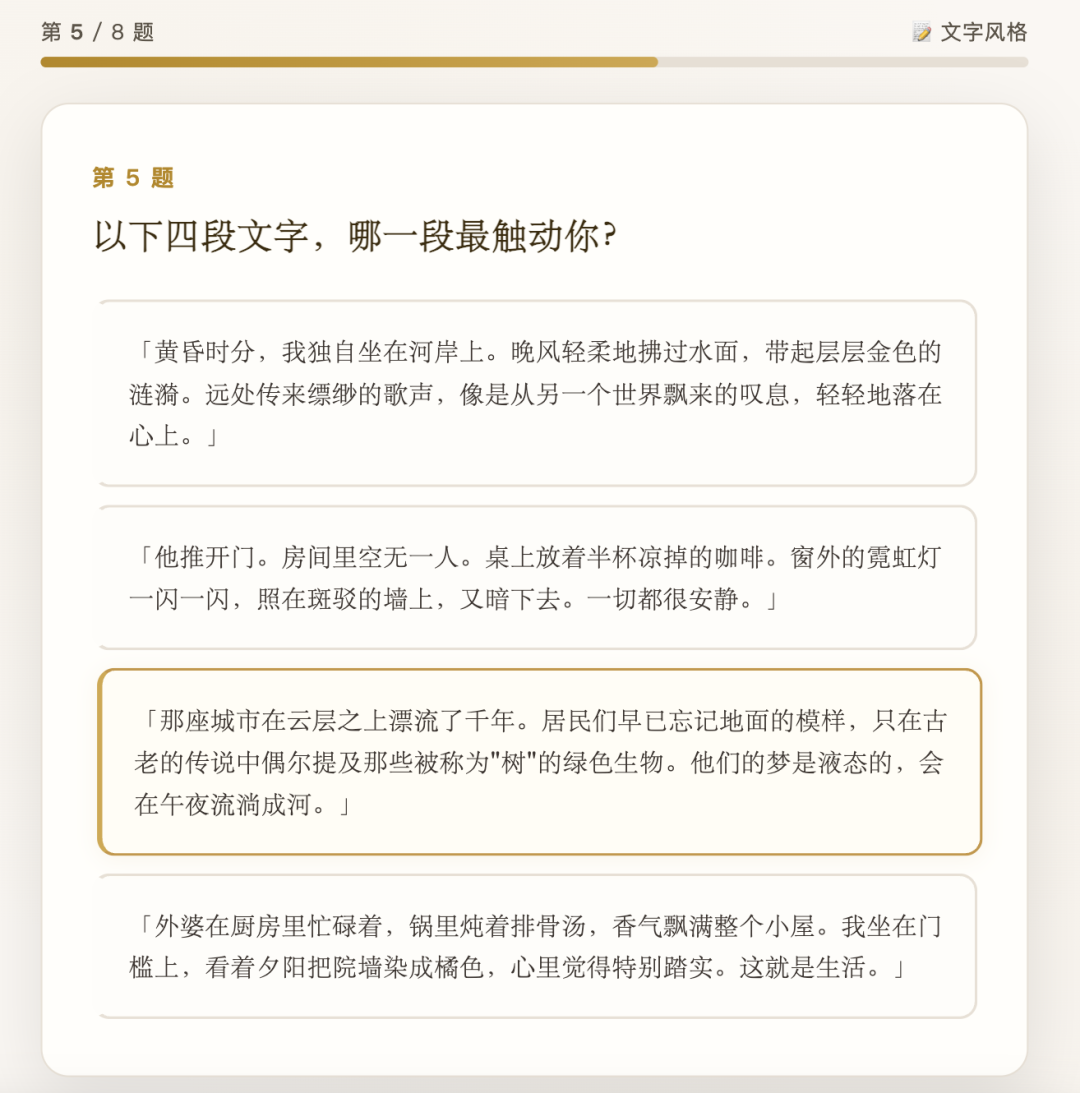 虽然不知道为什么秒悟在配色上唯爱清华紫,而且在出文本选择题的时候像吃了50吨张嘉佳(然而它自己建构的作家库里没有张嘉佳),但作为和朋友自娱自乐的小玩具,可用度还是非常高的。我自己做了测试,竟然真的测出了我喜欢的作家。