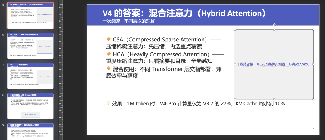 阅读其技术文档可以发现,全新的注意力机制结合了CSA (Compressed Sparse Attention,压缩稀疏注意力)和HCA (Heavily Compressed Attention,重度压缩注意力),其中CSA搭配DeepSeek自研的稀疏注意力算法,而HCA对键值缓存采用更高的压缩倍率,但保留了Transformer架构里的稠密注意力算法。粗浅理解一下,就是压缩得少的跳着看,已经被猛猛压缩过的那就每个都看。