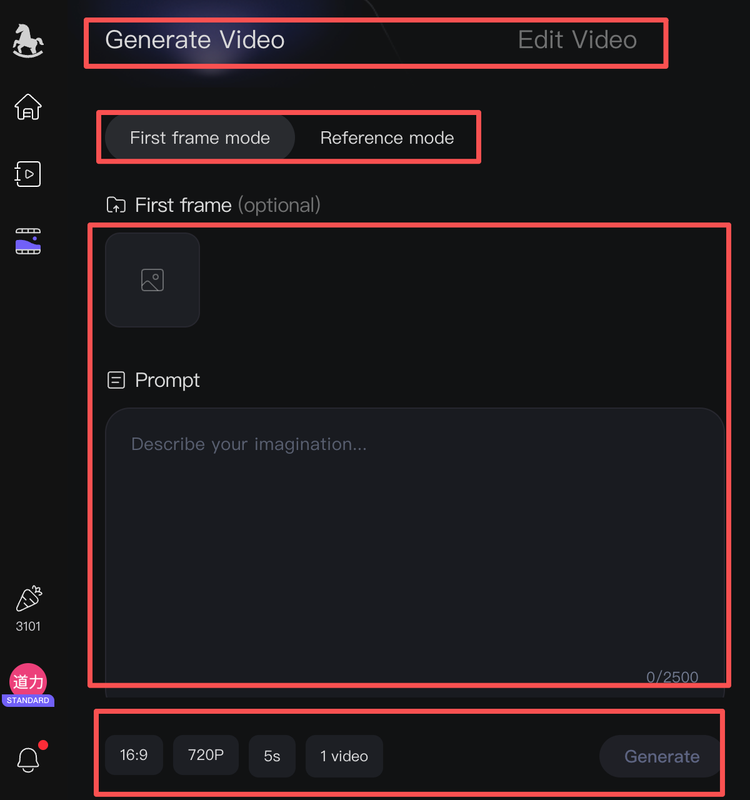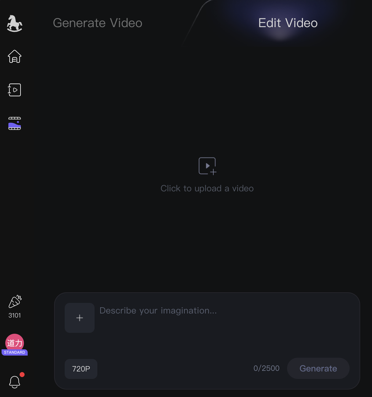 进入 HappyHorse 生成页面,分成两个大功能板块,生成视频和编辑视频。