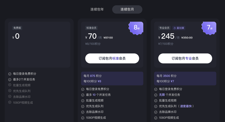 标准会员为 70 元/月,原价 87.50 元,目前为 8 折。每月包含 875 积分,折算为每 100 积分 8 元。功能包括每日登录免费积分、最多 10 个并发任务、批量生成视频、优先生成队列、去除品牌水印和 1080P 视频生成。