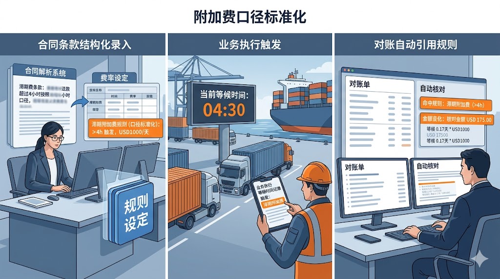 - 对账时系统按规则重算,并标出为何命中这条附加费。