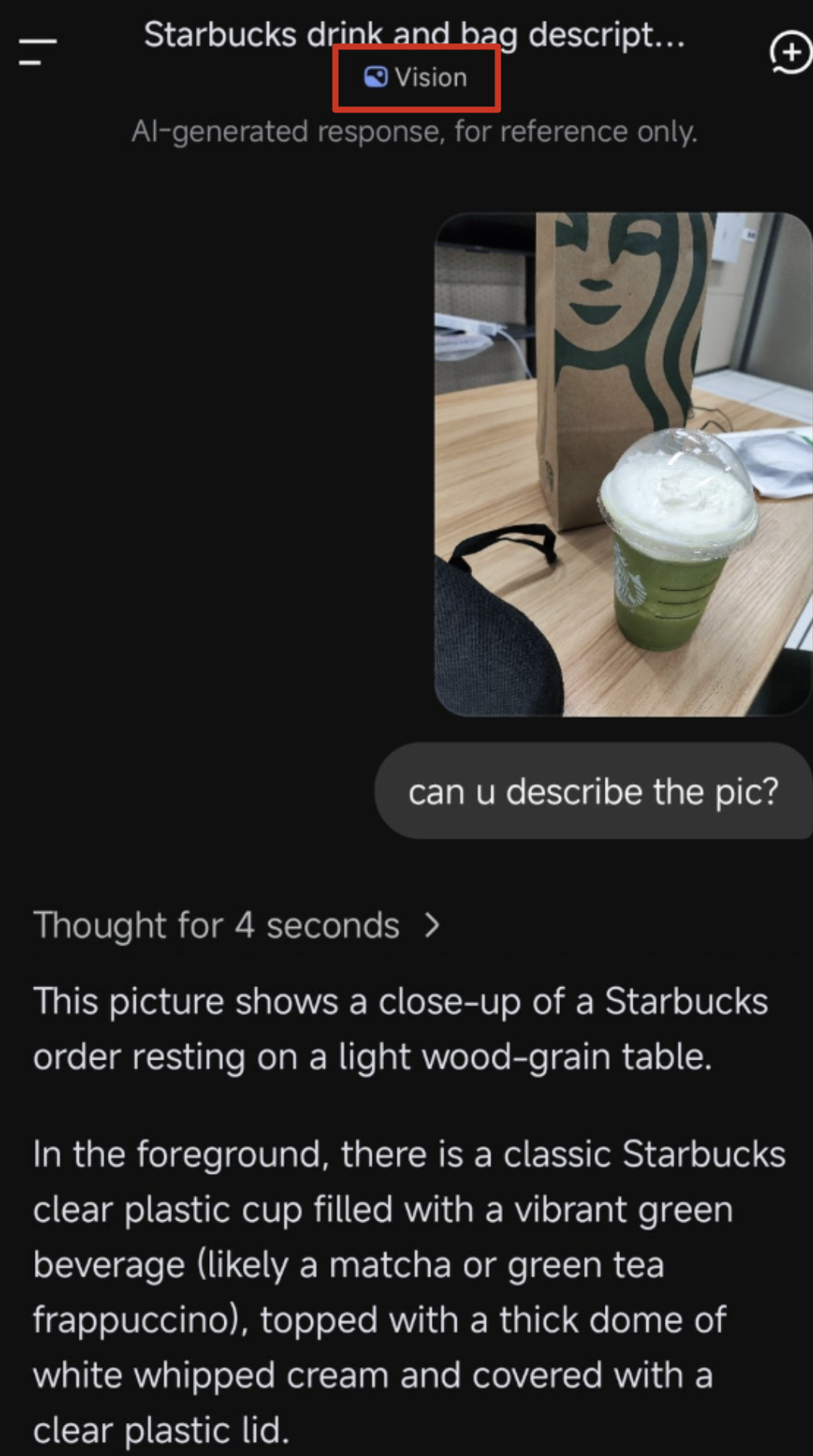 从幸运鹅分享的截图来看,DeepSeek视觉测试版已经具备真实图像理解能力,识别出了图片里的饮品、杯型等信息,思考4秒输出了完整的描述。