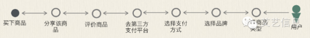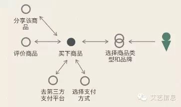 先用图形化的方式告诉大家这个方法的思路。用户使用你的APP一定是去满足一个他们的需求,或者说完成一个任务,达到一个目标。实心圆点代表这个目标。这个时候交互设计师的任务就是通过一个节点引导用户去完成这个目标。举例说:一个电商APP满足用户的最终需求是买下商品,这时就需要先让用户选择商品,然后提交订单,最终购买,并且这个目标是可循环的。因为出现了下面这个图: