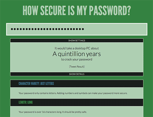 为什么我们不能要求用户输入一个长词组而却是一个个单独的字符? 为什么我的密码不能是“这是我的密码,我不怕任何人猜”? 长度保证了它的安全性,并且使它更容易记住。如果您的系统不喜欢空格,那么就将空格清除出去。你甚至可以提供一个选项:显示他们都输入了些什么。