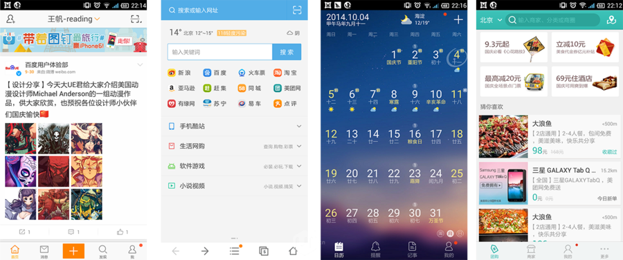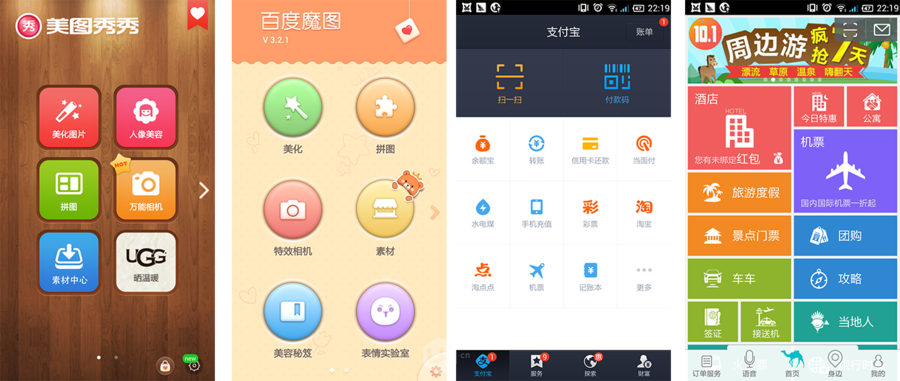 最典型的就是美图类应用,如美图秀秀,百度魔拍,在二级目录用九宫格,如旅游类应用,如携程,去哪儿,支付宝等。这种导航模式现在用越来越少了,在首页只有导航而没有实际的内容,和以内容为主的趋势相悖。
