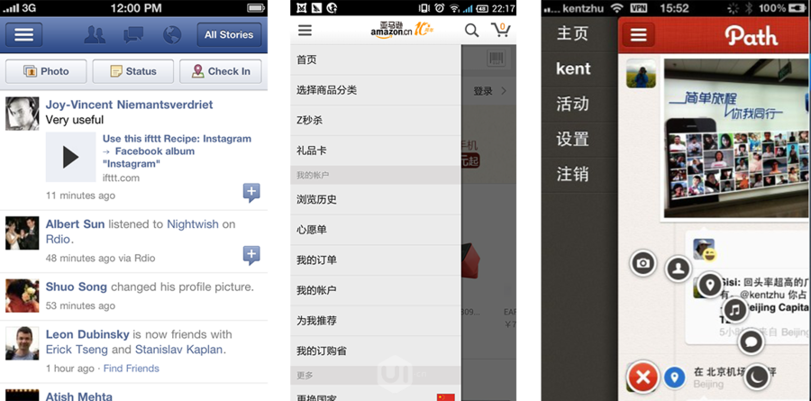 这种导航在社交的应用中最常见,比如Facebook,path,之前的Google+,购物类的应用入亚马逊,知乎客户端等,在iOS和Android平台上都 比较常见。现在汉堡菜单里, 抽屉导航在其二级页面可隐藏也可以不隐藏,一直出现。