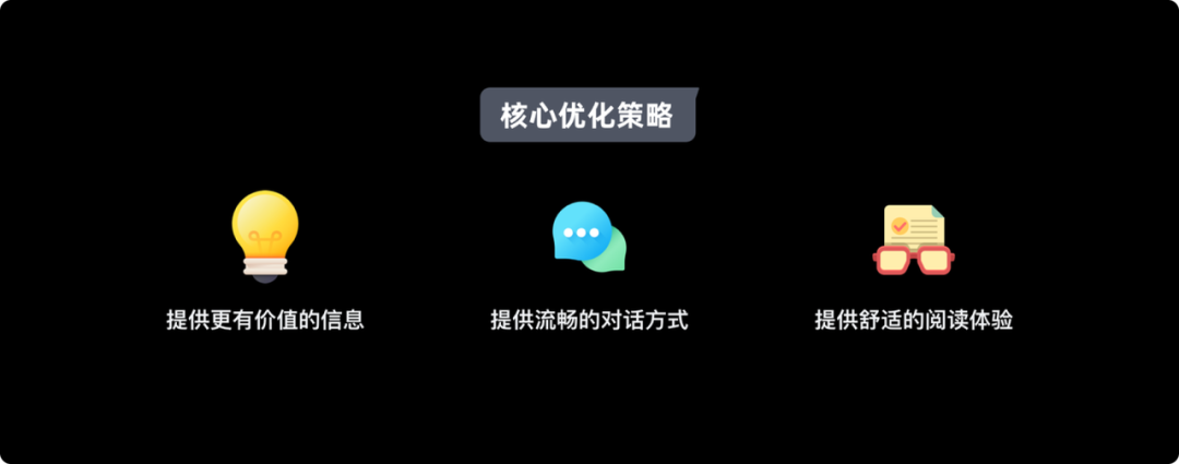 我们的核心优化策略是为用户提供「更有价值的信息」、「流畅的对话方式」以及「舒适的阅读体验」。