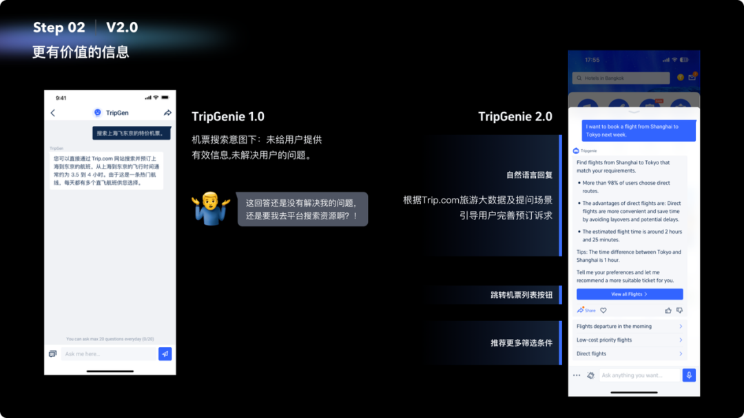 例如,在TripGenie1.0 版本中,当用户查询机票时,TripGenie 仅能引导用户到Trip.com的机票列表页搜索预订。