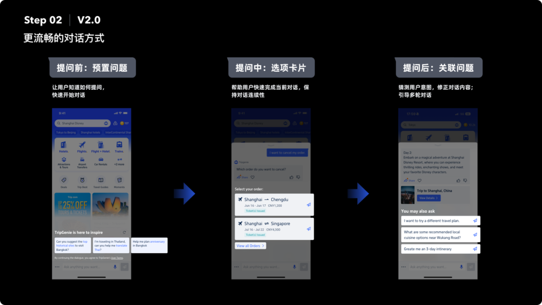 随着用户数量的增多,1.0 版本的基础对话框架和内容已无法满足用户诉求,优化使用体验变得尤为迫切。于是我们开启了 TripGenie 2.0 版本的探索。此版本旨在为用户提供更优体验,同时进一步提升 TripGenie 的使用流量。