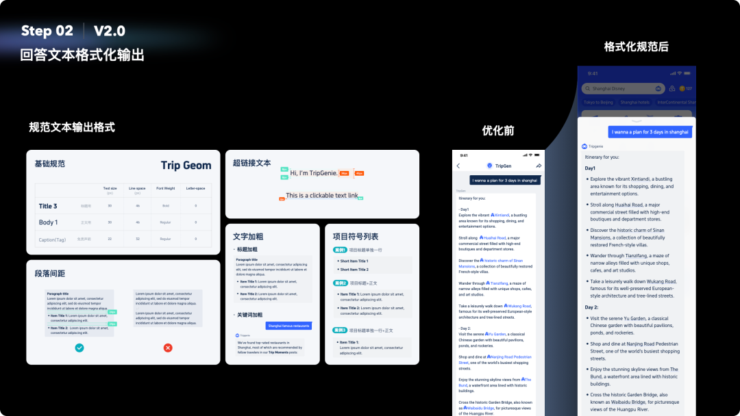 为此,我们对回答文本进行格式化输出,制定了字号、行高、字重等基础规范,还定义了统一的段间距及项目符号列表的使用场景,使长文本段落层级更清晰,阅读体验更顺畅。此外,用户调研显示,90% 的用户认为图文穿插的内容易读性更高,因此我们在长文本中加入图片展示。一系列优化后,用户满意度大幅提升。