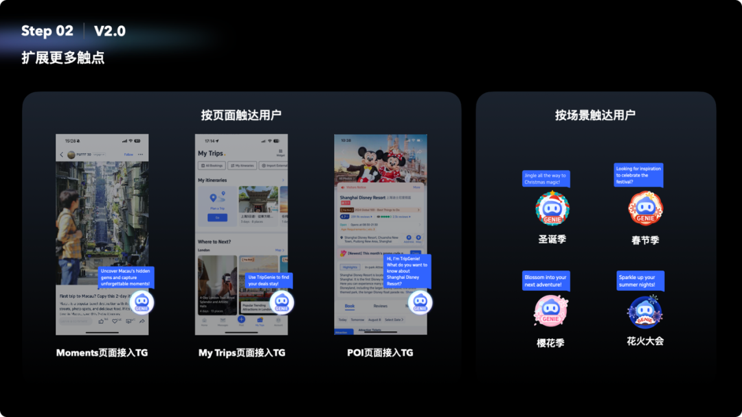 - 在页面场景上,已在Moments的内容页、MyTrips页面、POI页面增加了TripGenie的悬浮入口;