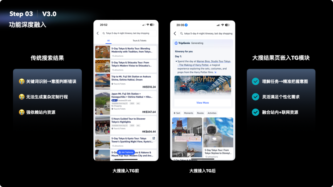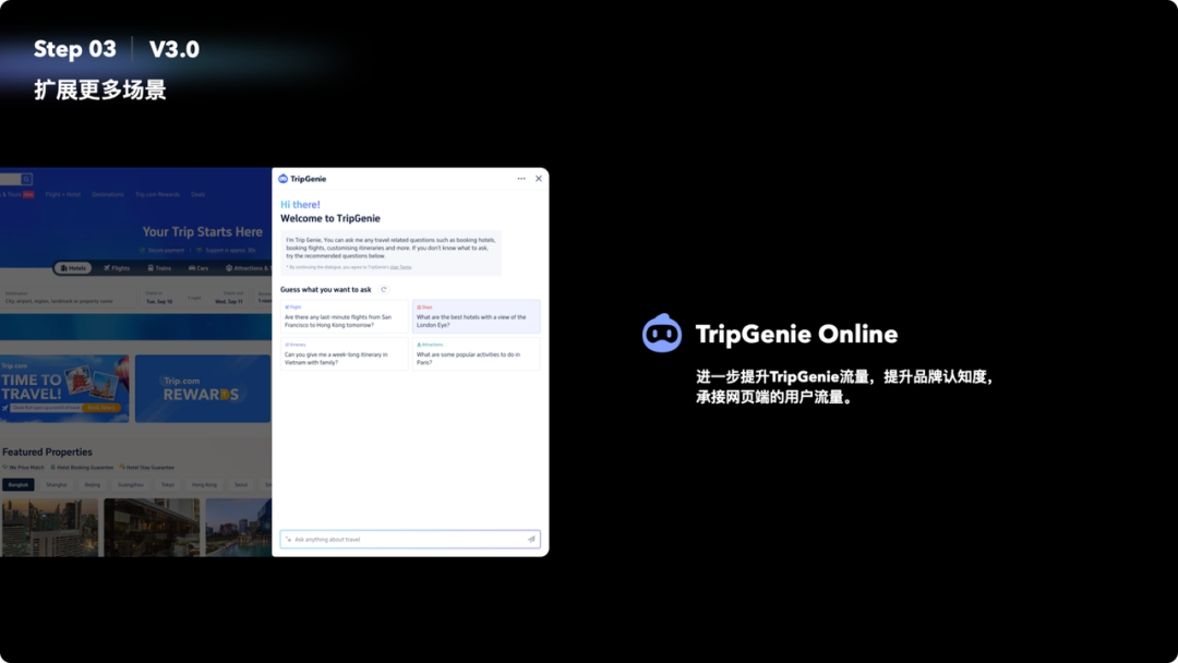 我们与综合搜索深度融合,过去的传统搜索更多依赖关键词匹配,难以理解用户背后的真实意图。引入 TripGenie 后,借助 AI 对复杂自然语言的理解能力,能够围绕用户的具体任务提供更智能的协同支持。