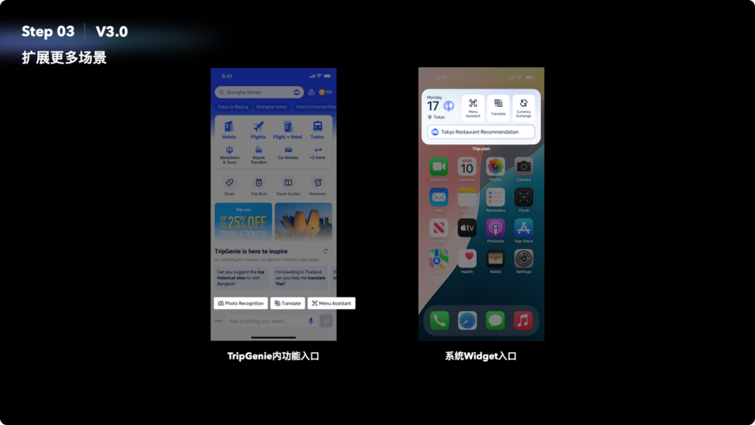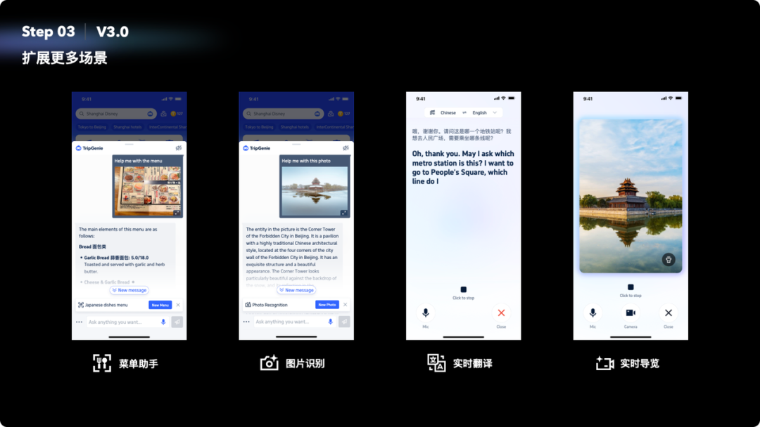 除了与现有功能融合外,TripGenie也在不断探索新功能,解决用户行中的问题。目前已在 TripGenie 内上线了菜单助手、图片识别、实时翻译等工具,并在大部分站点上线了实时导览功能。这些工具主要被用来应对境外旅行中遇到的语言问题;并且 TripGenie 已经将部分功能扩展至了系统级的Widget组件中,使得用户可以在需要它们的场合更快、更便捷的找到它们。