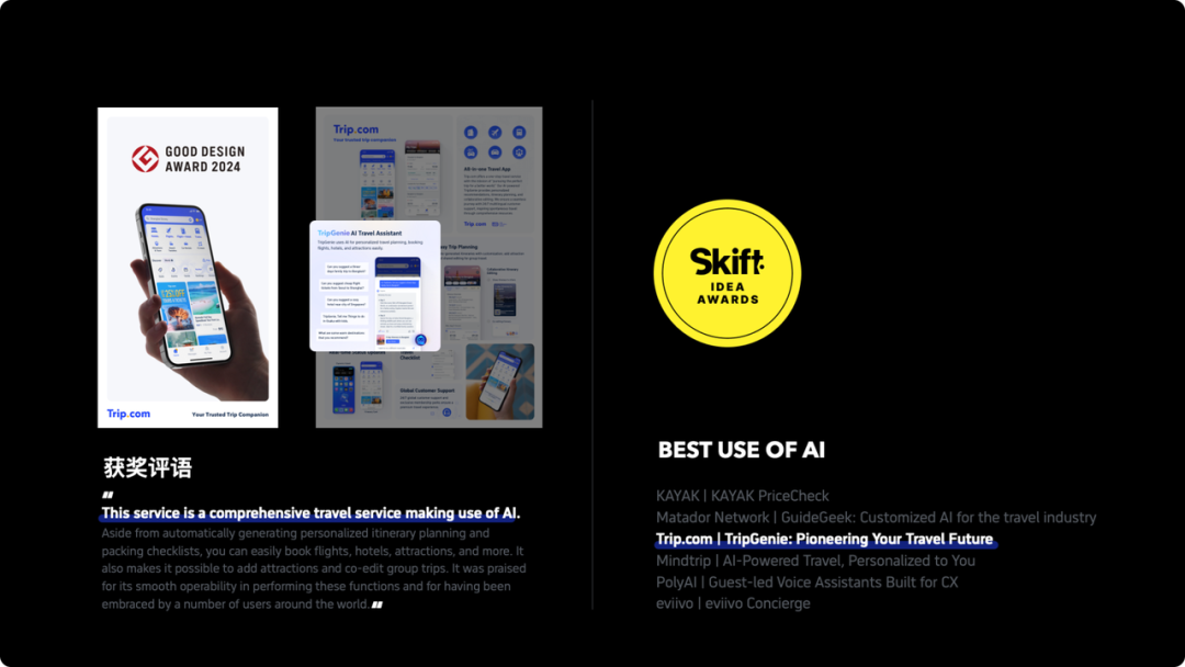 此外,Trip.com荣获了日本 G mark 2024设计大奖,TripGenie 作为重要功能参评并获得评委好评;同时,Trip.com 还因为 TripGenie 上榜了Skift idea award 的 Finalist,上榜理由为 Best use of AI,这些都是我们取得的成果。