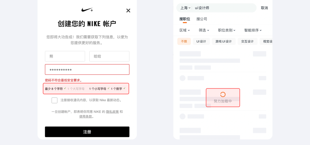 在Nike的注册界面中,会把密码的四个要求展示到页面上,用户每满足一个要求就会自动在要求上打一个对钩,真正做到实时反馈;网络慢的时候,用骨架屏的方式进行界面预加载提示,这些设计能让用户立刻知道操作有没有成功,从而快速做出决定。