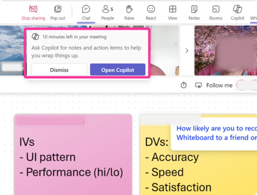 Copilot 根据时间自动显示“会议还剩 10 分钟”通知,并让用户轻松地“打开 Copilot”以生成会议记录。