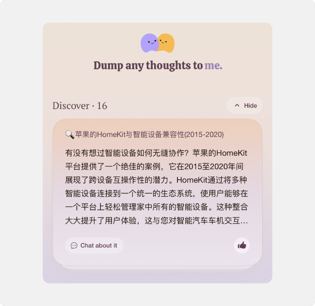 Me.bot 则进一步拓展了记忆的能力。它会根据用户不断上传的文字、图片、灵感、计划等形式的碎片化信息整合为结构化数据,生成个性化建议或回答。还可以根据个人的数据模拟用户的思维习惯,打造用户的“数字分身”,释放创造力。此外,它非常关注数据归于个人而非平台的理念,让用户放心使用而不用担心数据被泄漏。