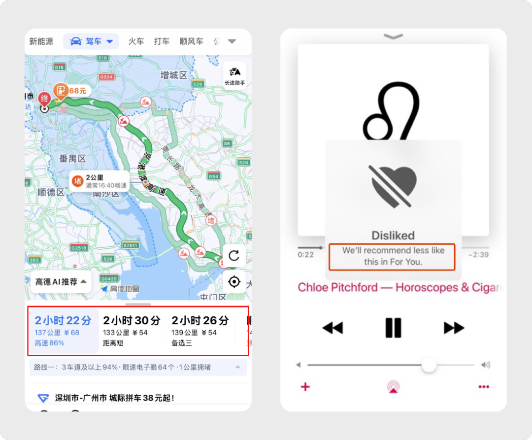 在用户采取行动前后,收集或确认用户的意图,都可以向用户传递其行为给 AI 带来的具体影响。比如在导航前让用户选择他的路线,在喜欢的音乐被取消收藏时将减少此类推荐。